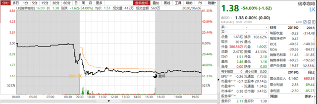 消息一出,開盤后瑞幸暴跌,連續(xù)六次觸發(fā)熔斷,最大跌幅超60%。最終收盤價(jià)為1.38美元/ADS,跌幅為54%。
