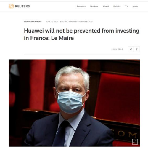 英國上周宣布將禁用華為后,其他歐洲國家對待華為的態(tài)度也受到關(guān)注。路透社21日最新消息說,法國財政部長勒梅爾當(dāng)天表示,法國不會禁止華為在法投資5G。