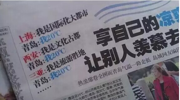 “青島:我20℃“,這是青島網(wǎng)友編的段子。2013年6月27日,這個(gè)段子經(jīng)《青島早報(bào)》報(bào)道后徹底火了,青島的清涼讓全國(guó)網(wǎng)友羨慕不已。每年一進(jìn)入6月份之后,青島網(wǎng)友就要拿出這個(gè)段子嘚瑟一番。