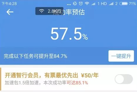 加速包有1元每個的,也有10元、20元、50元等分檔的,你可以自行選擇一次性購買的數(shù)量,購買的越多,顯示搶票成功的幾率就越大。除了加速包,還有成為VIP的選項,收費最貴為50元/年。