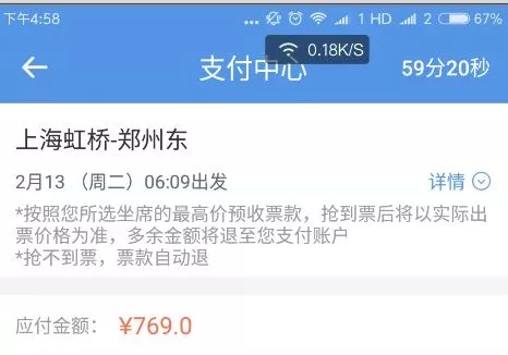 小編在智行APP上查詢了一下上海到鄭州,2月13日的火車票,果然需要搶票,鮮姐就選擇一等座,票價739元,反正不是真付款,奢侈一把: