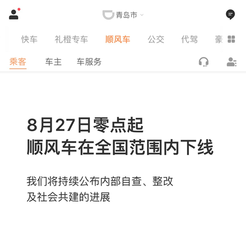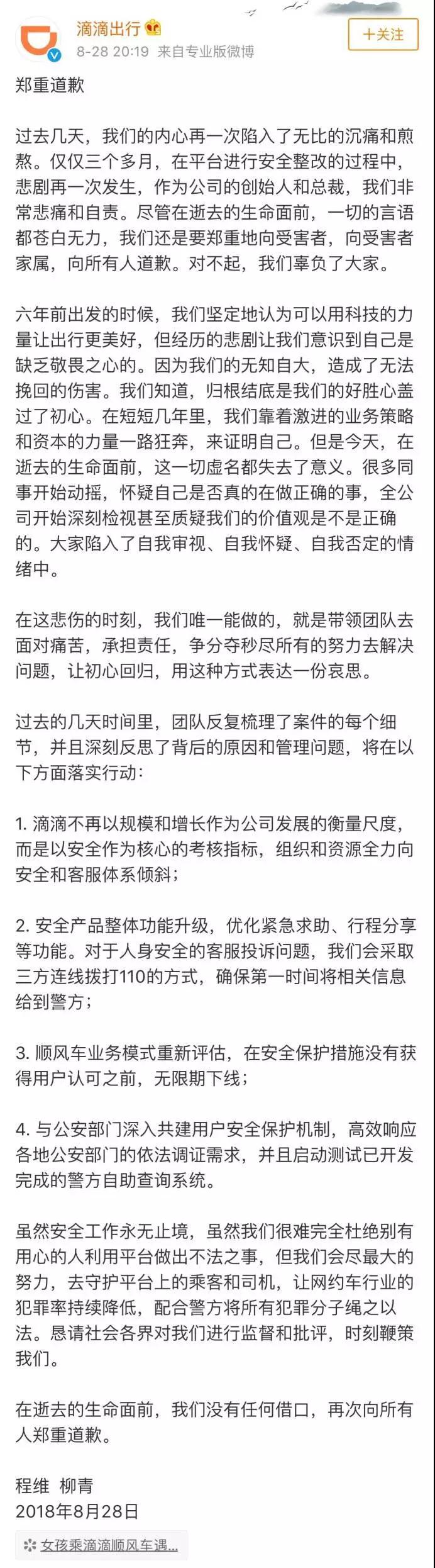 8月28日 20:20左右,滴滴出行創(chuàng)始人程維,總裁柳青終于對外發(fā)表了道歉聲明,滴滴不再以規(guī)模和增長作為公司發(fā)展的衡量尺度,順風車業(yè)務(wù)模式重新評估,在安全保護措施沒有獲得用戶認可之前,無限期下線。