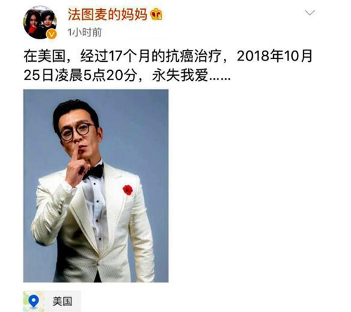 經(jīng)過17個月的抗癌治療,50歲的李詠于2018年10月25日在美國離開了人間。妻子哈文四天后在微博發(fā)布了去世消息,“凌晨5點(diǎn)20分,永失我愛……”