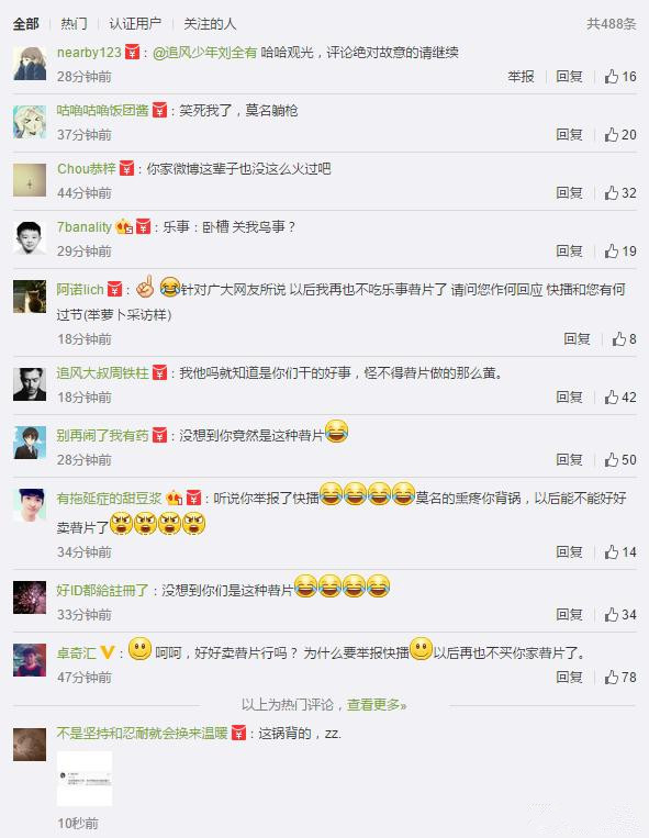 目前@樂(lè)事官方微博的評(píng)論中幾乎都是網(wǎng)友在吐槽舉報(bào)快播這回事兒,估計(jì)樂(lè)事自家的微博從來(lái)都沒(méi)有這么火爆過(guò)。