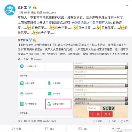 據(jù)支付寶官微介紹,目前北京、上海兩個(gè)城市開通“結(jié)婚登記預(yù)約”功能。東邊日出西邊雨,當(dāng)上海、北京的情侶互相在評論里@另一半的同時(shí),有網(wǎng)友說道“不忘初心,傷害完北京的單身汪,又去傷害上海的單身汪”。