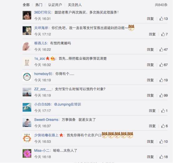 這么一個(gè)明顯自帶單身狗傷害屬性的功能,支付寶官微剛發(fā)布,一堆民間段子手就攻陷了支付寶官微的評論,直呼“這個(gè)功能太強(qiáng)大,單身狗已準(zhǔn)備卸載支付寶”、“請開發(fā)單身狗專用支付寶”、“還能不能讓我們生活得有點(diǎn)難度了”。